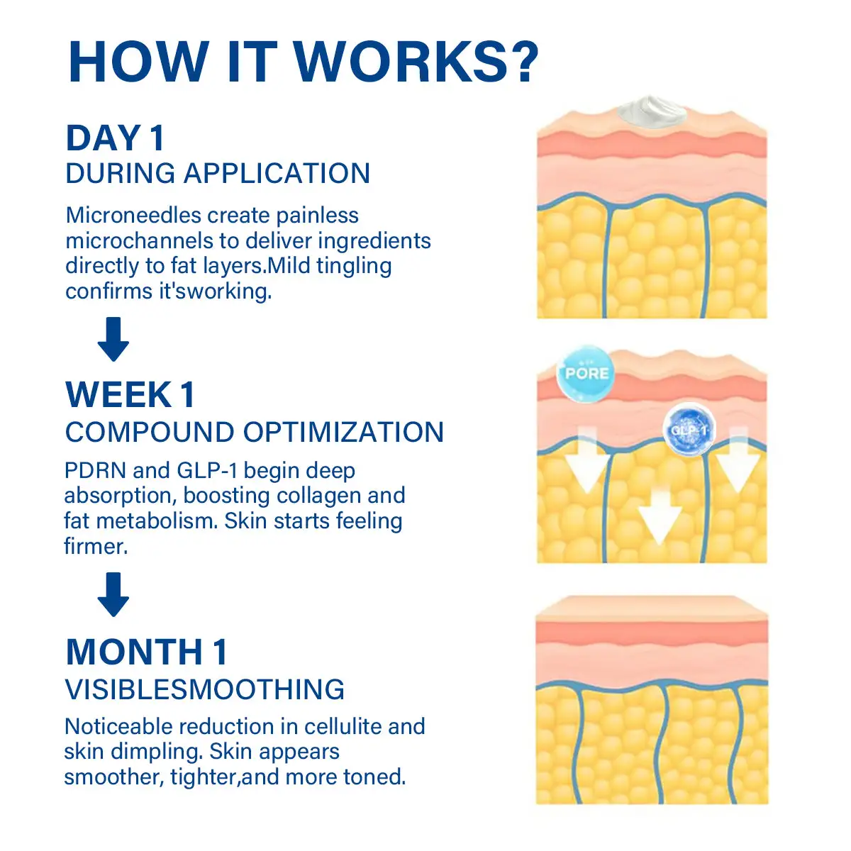 The advanced microneedle technology creates transient microchannels in your skin, allowing PDRN and to penetrate deep into subcutaneous layers where fat transformation occurs.Step 2: Fat Cell Conversion