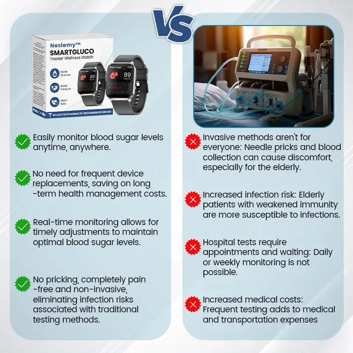 Effortlessly take control of your health with NESLEMY™ SmartGluco Tracker Wellness Watch! Say goodbye to painful finger pricks—monitor your blood sugar, blood pressure, oxygen levels, and heart rate all in one smart, non-invasive device. No pain, no hassle—just seamless health tracking at your fingertips!
