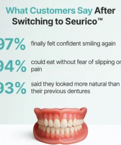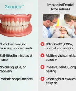 Instant Perfect Smile: Transform your smile instantly with the Seurico™ Custom-Fit Functional Dentures. Experience the satisfaction of achieving a flawless. customized fit right away. Our innovative denture set eliminates the discomfort of poorly fitting dentures, offering you a snug and natural feel that makes your dentures feel like a true part of your mouth. Say goodbye to sore spots and irritation as Seurico™ provides immediate relief. allowing you to enjoy your smile with newfound confidence and comfort. Enjoy a seamless transition to a better-fitting, more comfortable denture experience without delay.