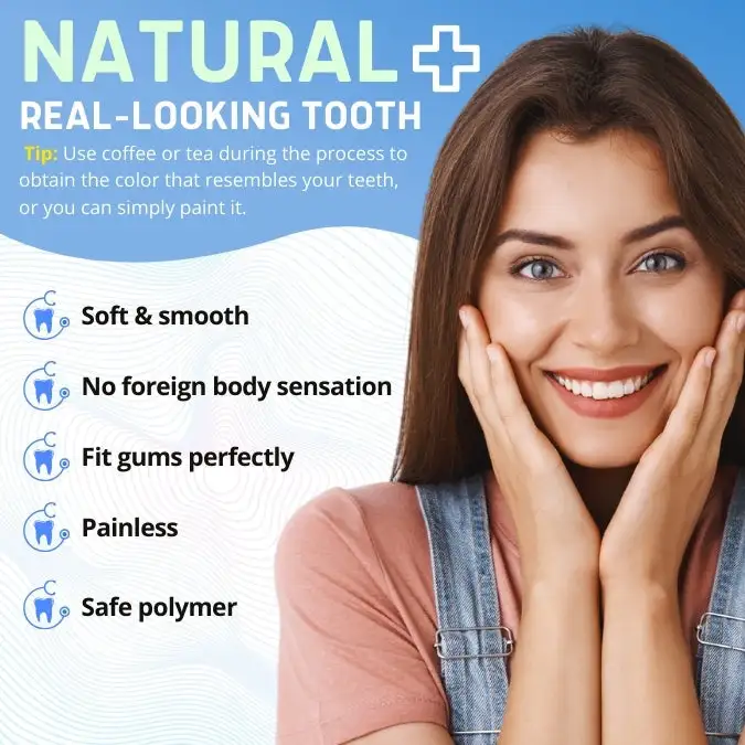 - Customizable fit: thermal forming process allows for molding the false teeth to a patient’s unique shape at home