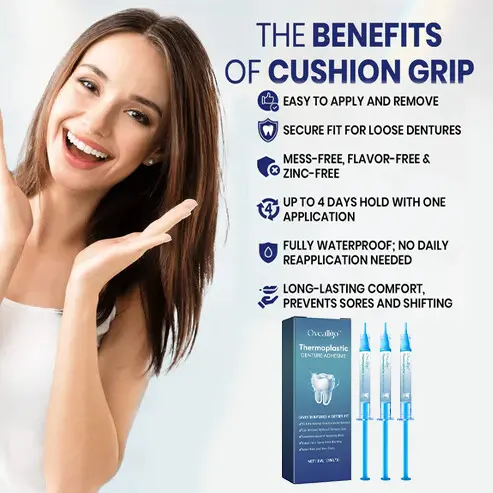 Opt for Oveallgo™ for ultimate denture comfort. Its customizable silicone reline offers immediate sore relief and enduring fit. Safe and non-toxic, it ensures denture stability for confident daily activities.