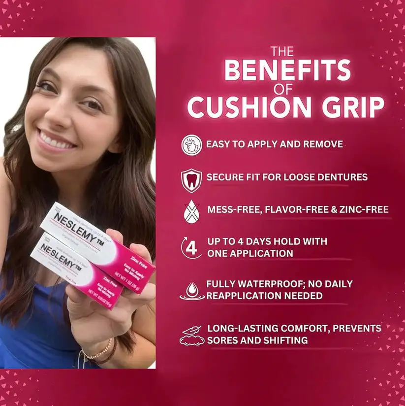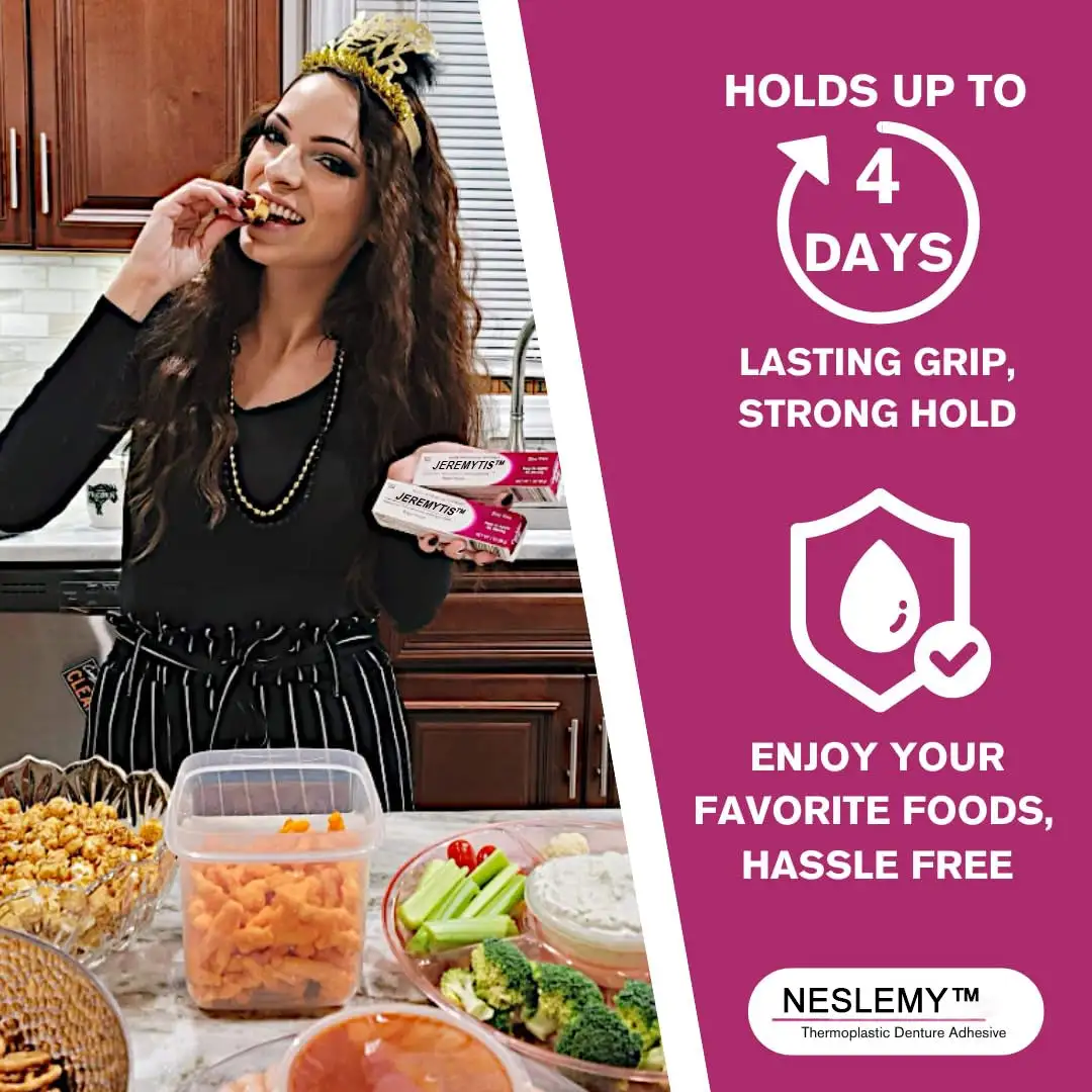 “NESLEMY™ has truly transformed my daily life! Now I can enjoy my meals and smile all day without denture pain.”–Lily Hall