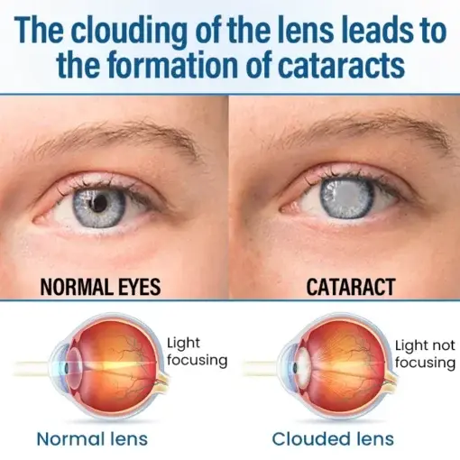 Cataracts: Protein clumps form in the lens, creating a “white haze” that makes the world blurry.