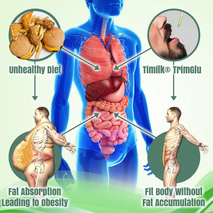 The study found that Timilk® TrimGlu Diet Drops help reduce calorie absorption, balance blood sugar, and lower cholesterol levels without requiring a strict diet. It also aids in breaking down stubborn fat, improving liver health, and promoting fat burning. Additionally, it reduces stomach size, lowers hunger hormones, controls appetite, increases satiety, relieves mental stress, and strengthens the immune system.