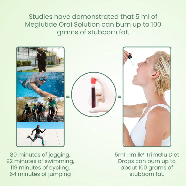 Studies have demonstrated that 5 ml of Meglutide Oral Solution can burn up to 100 grams of stubborn fat. In comparison, it would take much longer to burn 50 grams of fat through exercise—around 80 minutes of jogging, 92 minutes of swimming, 119 minutes of cycling, or 64 minutes of jumping rope.