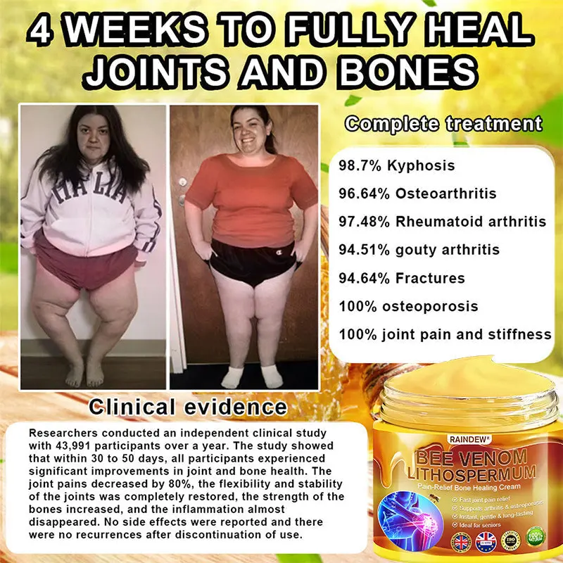 “For years, I struggled with constant knee pain and swelling—my friends used to joke that my knees looked like footballs. When I came across RAINDEW® BEE VENOM LITHOSPERMUM Pain-Relief Bone Healing Cream, I thought I’d give it a go, and it turned out to be the best decision! In less than three weeks, I noticed an incredible improvement—my knee pain eased significantly, and the swelling completely disappeared. Now, I feel like I’ve fully recovered, and this cream has truly made a difference in my life. I’m so grateful for it!”– Isabella Walker