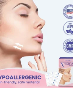 The LUHAKA® V-Face Lifting Adhesive Tape offers an instant solution for a face-lifting effect, eliminating the need for surgical procedures. Our product is designed to adhere gently to the sides of your face, lifting and pulling your skin upwards and backwards, creating a more V-shaped appearance, all while being gentle on the skin.
