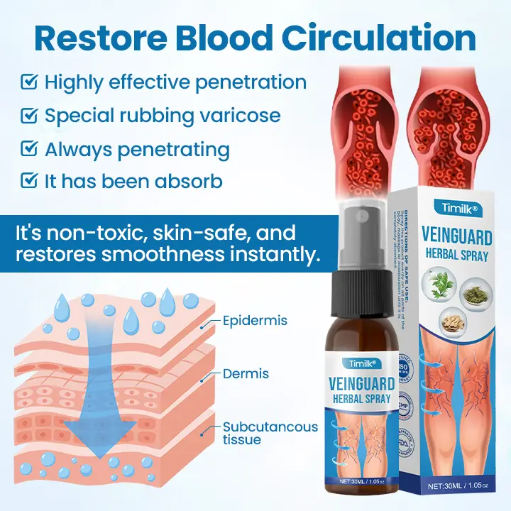 Timilk® VeinGuard Herbal Spray uses advanced transdermal delivery to send active plant-based compounds deep into the dermis, where microcirculation is impaired and damaged veins reside. Clinically supported, it helps weakened veins collapse, allowing the body to naturally break them down—relieving swelling, visible bulging, and Enhances microcirculation to reduce risk of blood stagnation.