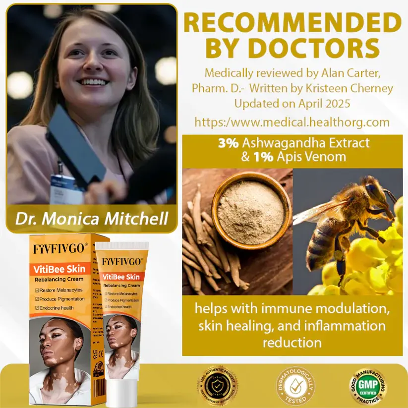 Certified by Dr. Monica Mitchell on February 16, 2025, Fivfivgo® VitiBee Skin Rebalancing Cream is clinically recognized for its unique dual-action formula that addresses pigmentation concerns associated with hormonal imbalance and immune dysfunction. The cream combines 2% Ashwagandha Extract and 1% Apis Venom—two botanical ingredients backed by endocrine and dermatological research. Ashwagandha helps regulate cortisol levels, restoring hormonal harmony and supporting pigmentation balance, while Apis venom aids in immune modulation and skin cell regeneration.